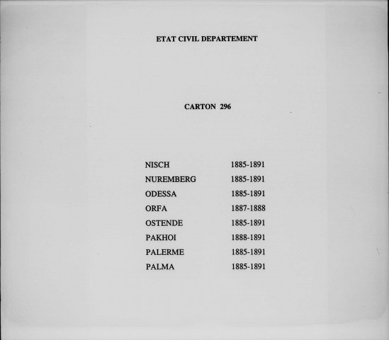 Registres d'état civil consulaire : naissances, mariages, décès. Ces registres consistent souvent en de simples cahiers de quelques feuillets ou des volumes reliés couvrant chacun une année. Cependant, les registres d'état civil de certains postes, en particulier d'Afrique du Nord, ont été reliés avant leur versement aux Archives diplomatiques en volumes regroupant les registres sur plusieurs années. Certains registres ne contiennent aucun acte.