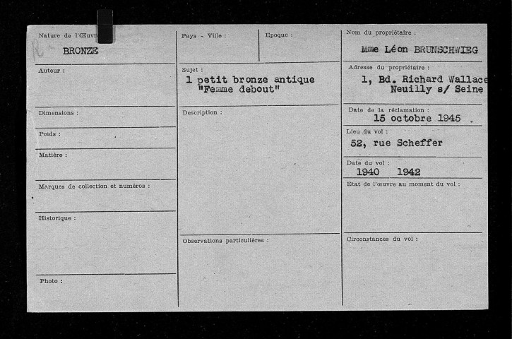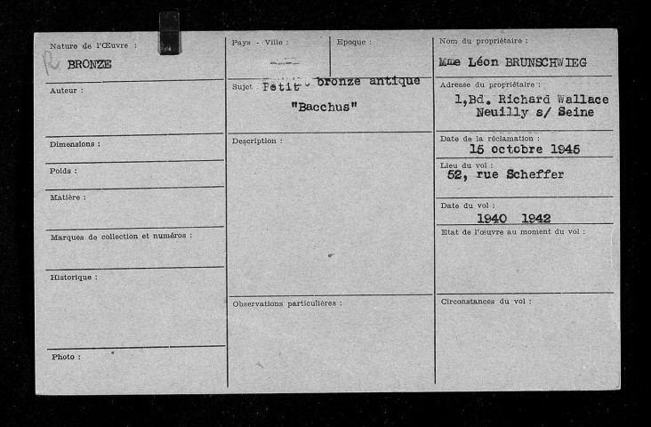 Les fichiers d'œuvres spoliées (série « Fichiers », cotée 209SUP/738-887) ont été établis d'après les déclarations de victimes ou d'après la listes des biens retrouvés en Allemagne et en Autriche.