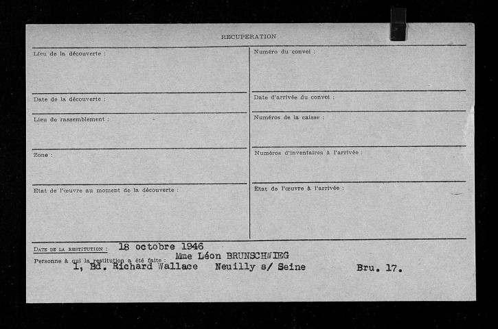 Pour les fiches peintures et dessins (cartons 738 à 760 et 805bis à 809), voir la liste Excel. Les informations relatives aux restitutions ou aux non restitutions doivent pêtre prises avec précaution et confirmées par les décharges de restitutions (série CRA ou série 13BIP).
