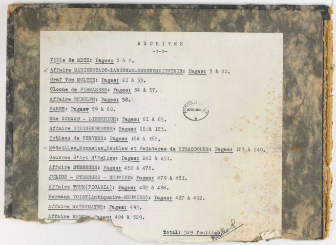 Ce fonds constitue la principale source française d'informations sur les spoliations de biens culturels commises contre les victimes juives (Alliance israélite universelle, consistoires, particuliers) et les victimes non juives (musées, bibliothèques, particuliers) pendant la Seconde Guerre mondiale. Il donne des éléments d'information sur les biens signalés spoliés par les victimes ou rapatriés par les services chargés de la récupération artistique. Il peut donner des informations sur l'itinéraire du bien, sa spoliation, sa récupération éventuelle et son rapatriement.