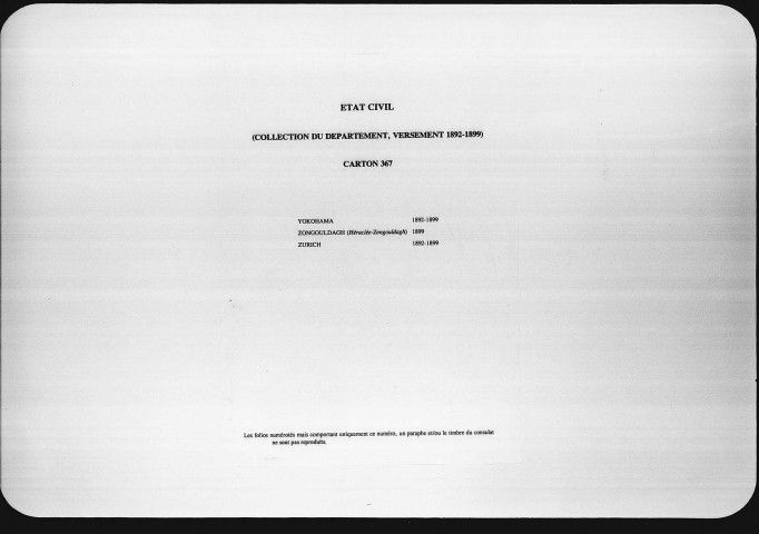 Il est également à noter que le versement des registres d'état civil de 1900 n'avait été effectué que pour les postes d'Aden à Rome. Les registres des postes de Rosario à Zurich avaient été classés dans la série 486QO. Ces derniers en ont été extraits en 2024 pour être réintégrés dans la sous-série 1900 de la série 172QO où ils constituent les cartons 372 à 374.