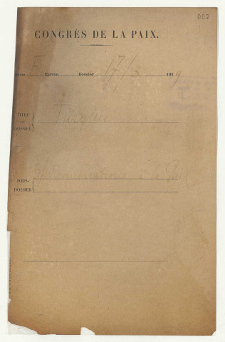 Massacres de chrétiens et de musulmans, question kurde, statut en Turquie des Polonais, Tchécoslovaques, Yougoslaves et Monténégrins, demandes de règlement de la question d'Orient [à noter la présence de listes et de tableaux statistiques présentant la répartition des différentes confessions dans l'ancien Empire ottoman] (février 1919-février 1922).