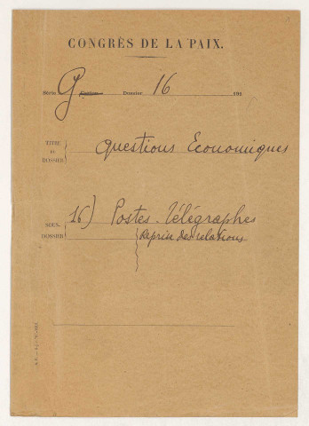 Questions de la propriété des câbles sous-marins et du réseau allemand, renforcement des communications entre les Etats de la Conférence, création de la Conférence Postale internationale, installation de Télégraphie sans fil en Argentine, exploitation d'un central télégraphique à Berlin pour les gouvernements alliés, mise en place de nouvelles taxes postales pour les membres des commissions de délimitation, établissement de nouveaux câbles téléphoniques souterrains en territoires occupés (avril 1919-février 1925).