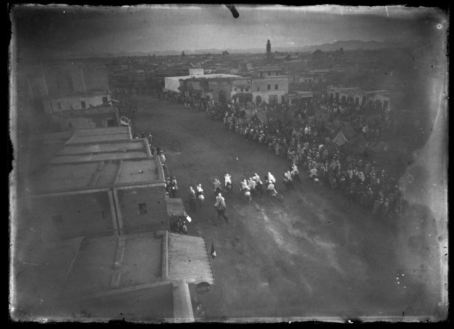 Fantasia, cavaliers lancés au galop dans une rue bordée de nombreux spectateurs (plaque de verre).