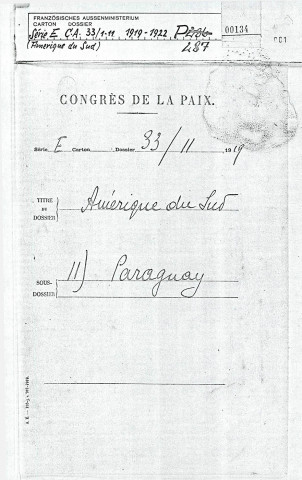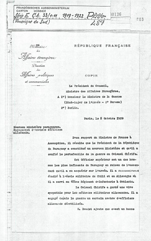 Engagement d'anciens officiers allemands dans l'armée et la marine paraguayennes [dont liste nominative] (octobre-décembre 1920) ; avis rendu par le Comité militaire allié de Versailles (18 janvier 1921) ; demande de la Conférence des ambassadeurs au gouvernement allemand de respecter les stipulations de l'article 179 du traité de Versailles et d'empêcher le départ de nationaux allemands ayant l'intention d'entrer dans l'armée, la flotte ou le service d'aviation d'une puissance étrangère (novembre 1920-février 1921).