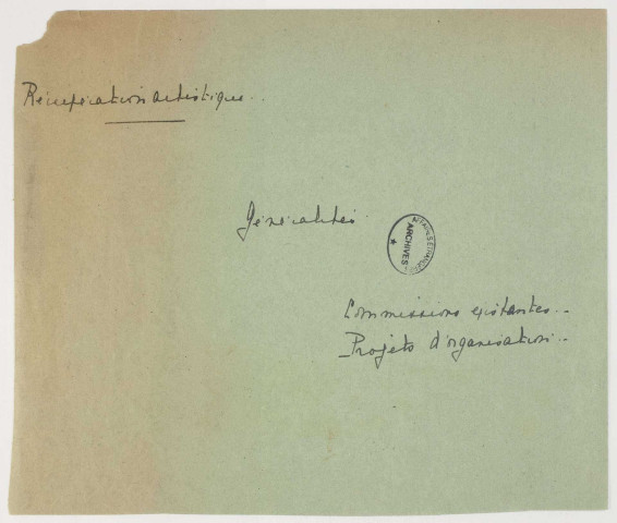 Ces archives ont été produites par les services français de récupération artistique créés à la fin de la Seconde Guerre mondiale en vue de rapatrier et de restituer à leurs légitimes propriétaires les biens spoliés par l'ennemi pendant l'Occupation. Elles concernent les recherches conduites en France et dans les anciens territoires sous domination nazie pour retrouver la trace de ces biens œuvres et objets d'art, livres, archives et manuscrits soit qu'ils aient fait l'objet d'une spoliation, en particulier à la suite des mesures raciales antisémites, soit qu'ils aient été acquis régulièrement sur le marché français puis sortis du territoire par l'ennemi. La spoliation et la sortie de ces biens ont été considérées par les Alliés comme un pillage du patrimoine national et une attaque contre le droit de propriété. Les transferts et trafics de biens ont été considérés comme nuls, « que de tels transferts ou trafics aient revêtu la forme, soit d'un pillage manifeste, soit de transactions en apparence légale, même si lesdits transferts ou trafics sont présentés comme ayant été effectués sans contrainte » (Déclaration des Alliés, Londres, 5 janvier 1943, traduite en droit interne dans les ordonnances du 12 novembre 1943, 14 novembre 1944, 2 février, 21 avril et 9 juin 1945).