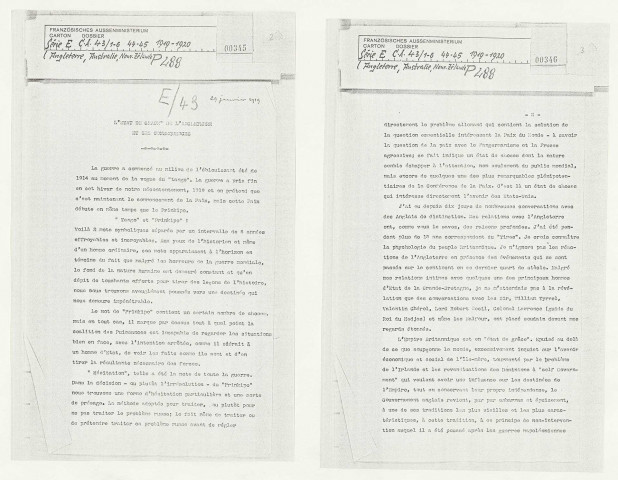Etat de grâce de l'Angleterre, recherche d'Ecossaises enlevées par l'ennemi pendant la guerre, examen parlementaire du Traité de Paix, politique des Alliés en Europe et en Orient, politique et commerce intérieurs et extérieurs britanniques (janvier 1919-juin 1920).