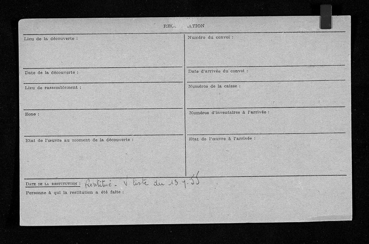 Pour les fiches peintures et dessins (cartons 738 à 760 et 805bis à 809), voir la liste Excel. Les informations relatives aux restitutions ou aux non restitutions doivent pêtre prises avec précaution et confirmées par les décharges de restitutions (série CRA ou série 13BIP).
