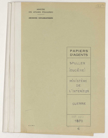 Le fonds Spuller est composé de deux parties bien distinctes. La plus ancienne traite de ses fonctions durant la Défense nationale, en 1870 et 1871, quand il accompagne Gambetta à Tours ; sa correspondance est alors classée dans l'ordre alphabétique des départements (nombre des lettres sont d'ailleurs adressées à Gambetta). La plus récente est composée de correspondance relative à ses fonctions ministérielles aux Affaires étrangères, classée dans l'ordre alphabétique des pays.