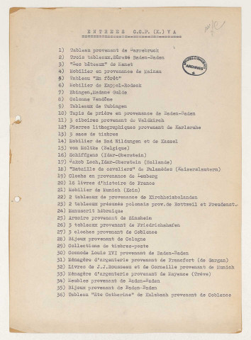 Les fichiers d'œuvres spoliées (série « Fichiers », cotée 209SUP/738-887) ont été établis d'après les déclarations de victimes ou d'après la listes des biens retrouvés en Allemagne et en Autriche.