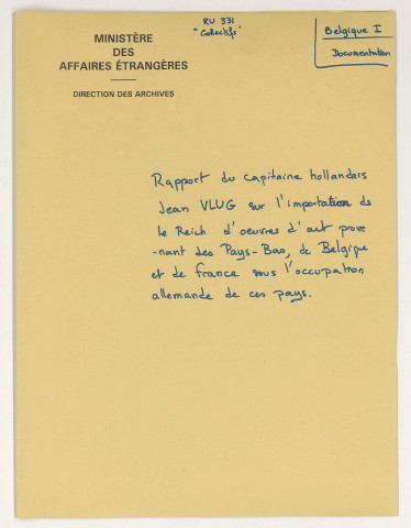 Ce fonds constitue la principale source française d'informations sur les spoliations de biens culturels commises contre les victimes juives (Alliance israélite universelle, consistoires, particuliers) et les victimes non juives (musées, bibliothèques, particuliers) pendant la Seconde Guerre mondiale. Il donne des éléments d'information sur les biens signalés spoliés par les victimes ou rapatriés par les services chargés de la récupération artistique. Il peut donner des informations sur l'itinéraire du bien, sa spoliation, sa récupération éventuelle et son rapatriement.
