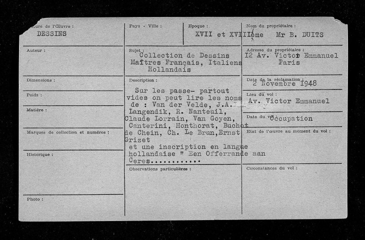 Les fichiers d'œuvres spoliées (série « Fichiers », cotée 209SUP/738-887) ont été établis d'après les déclarations de victimes ou d'après la listes des biens retrouvés en Allemagne et en Autriche.