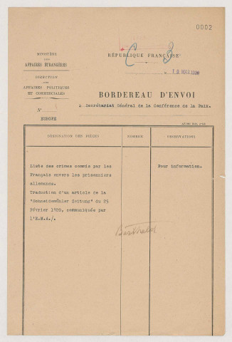 F delta res 0801 (1) Fonds des Conférences de la Paix. Première Guerre mondiale