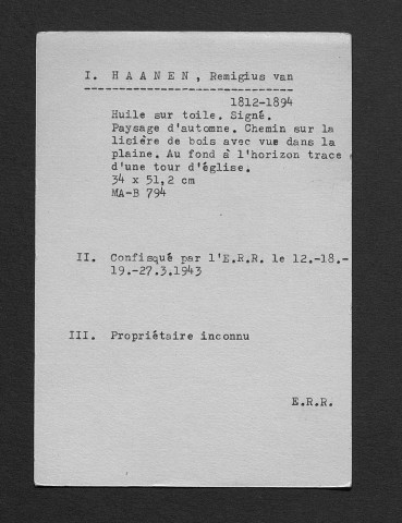 Pour les fiches peintures et dessins (cartons 738 à 760 et 805bis à 809), voir la liste Excel. Les informations relatives aux restitutions ou aux non restitutions doivent pêtre prises avec précaution et confirmées par les décharges de restitutions (série CRA ou série 13BIP).