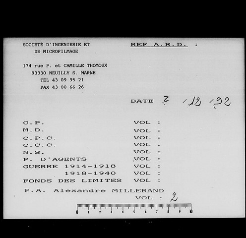 Le fond Millerand comprenait au départ 41 cartons; le travail de classement a surtout consisté en l'articulation des différentes séries qui ont été divisées en 101 volumes : les plus intéressants ont été reliés. Un inventaire numérique du nouveau classement a été établi; pour faciliter les recherches, on a dressé une table de concordance de l'ancien et du nouveau classement.