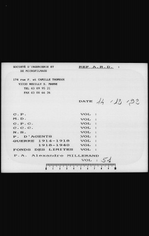 Le fond Millerand comprenait au départ 41 cartons; le travail de classement a surtout consisté en l'articulation des différentes séries qui ont été divisées en 101 volumes : les plus intéressants ont été reliés. Un inventaire numérique du nouveau classement a été établi; pour faciliter les recherches, on a dressé une table de concordance de l'ancien et du nouveau classement.