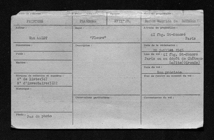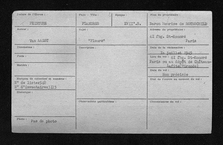 Les fichiers d'œuvres spoliées (série « Fichiers », cotée 209SUP/738-887) ont été établis d'après les déclarations de victimes ou d'après la listes des biens retrouvés en Allemagne et en Autriche.