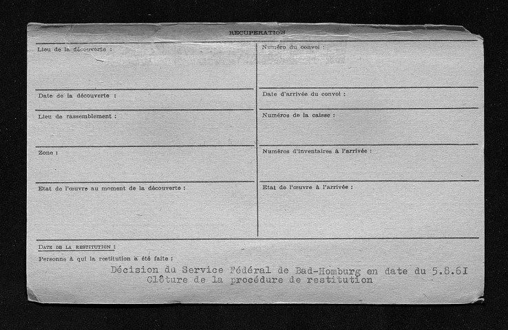 Pour les fiches peintures et dessins (cartons 738 à 760 et 805bis à 809), voir la liste Excel. Les informations relatives aux restitutions ou aux non restitutions doivent pêtre prises avec précaution et confirmées par les décharges de restitutions (série CRA ou série 13BIP).