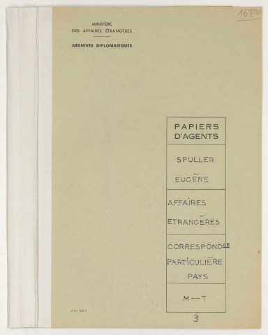 Le fonds Spuller est composé de deux parties bien distinctes. La plus ancienne traite de ses fonctions durant la Défense nationale, en 1870 et 1871, quand il accompagne Gambetta à Tours ; sa correspondance est alors classée dans l'ordre alphabétique des départements (nombre des lettres sont d'ailleurs adressées à Gambetta). La plus récente est composée de correspondance relative à ses fonctions ministérielles aux Affaires étrangères, classée dans l'ordre alphabétique des pays.