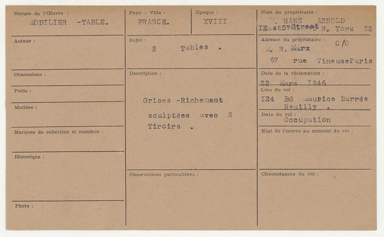 Les fichiers d'œuvres spoliées (série « Fichiers », cotée 209SUP/738-887) ont été établis d'après les déclarations de victimes ou d'après la listes des biens retrouvés en Allemagne et en Autriche.