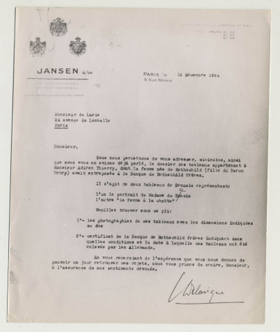 Voir Anne Liskenne, "Le catalogue des peintures et les photographies de la collection : un parcours chaotique et inédit", et Pascal Even, "Le catalogue Goeing : dans les archives dites des spoliations conservées aux Archives diploamtiques", dans Les Archives diplomatiques et J.-M. Dreyfus, Le Catalogue Goering, Paris : Flammarion, 2015, p. 81-93.