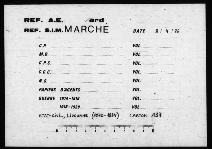 Les registres ayant été versés en volumes reliés de plusieurs années, ne correspondant pas au découpage chronologique ci-dessus, ont été intégrés dans série ad hoc, dite des Volumes par opposition aux sous-séries des Cartons.