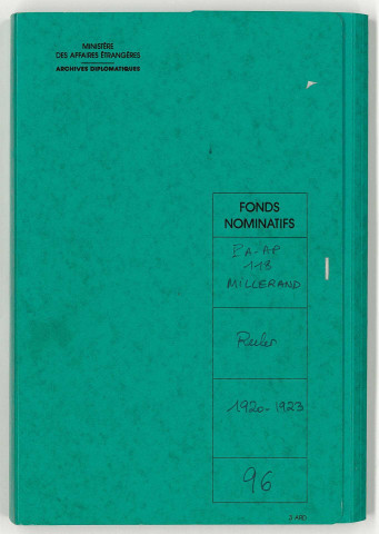 Les documents conservés au ministère des Affaires étrangères concernent presqu'exclusivement la politique étrangère de l'époque où Millerand était président de la République, de 1920 à Juin 1924 ; quelques dossiers sont plus anciens : ainsi ceux des questions coloniales (1894-1921) et de la Suisse (1912-1924).