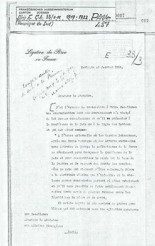 Arbitrage de la Conférence de la paix dans le conflit qui oppose le Pérou, le Chili et la Bolivie au sujet des territoires de Tacna, Arica et de Tarapaca (janvier-mai 1919). Réflexions de la délégation péruvienne sur la responsabilité des auteurs de la guerre, les crimes commis pendant la guerre et la législation internationale du travail (s.d.). Réception du nouvel ambassadeur allemand à Lima (janvier-février 1921).