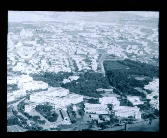 Ensemble des bâtiments administratifs de la Résidence générale, vus d'avion.