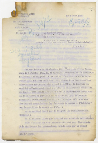 Demandes de ralliement à la Grèce, protestations bulgares sur l'évacuation de la Thrace, question des réfugiés bulgares, organisation et administration de la Thrace interalliée, question du matériel de Guerre laissé par la Bulgarie en 1920 et saisie par le contrôle interallié puis transféré à la Grèce, traité entre les puissances alliées et la Grèce, accords avec la Bulgarie (décembre 1918-avril 1929).