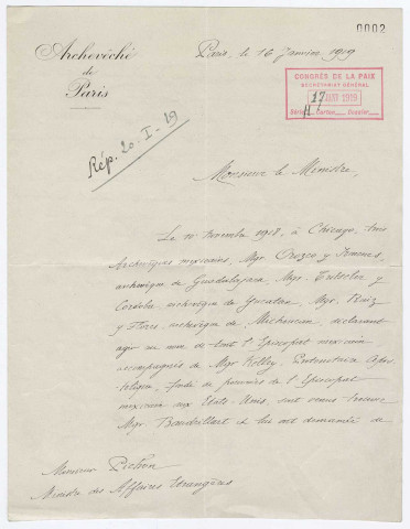 Relations avec les gouvernements étrangers, avis du Saint-Siège sur les conditions de paix avec l'Allemagne et l'Autriche et sur la libération des prisonniers de guerre, influence politique en Italie et Allemagne, persécutions religieuses (Mexique, Autriche, Bohème, Trente), missions catholiques, canonisation de Jeanne d'Arc à Rome, discussion d'un concordat avec la Grèce, décès de Benoît XV, attributions de décorations religieuses à des évêques (janvier 1919- août 1920)