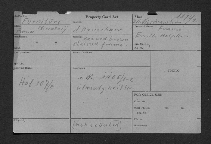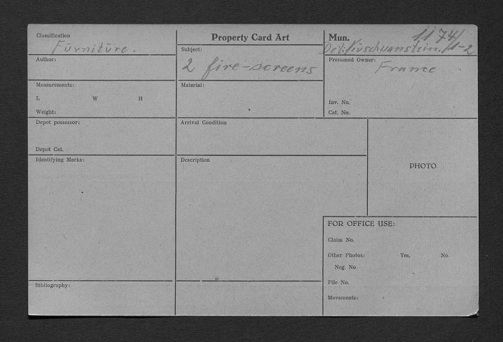 Les fichiers d'œuvres spoliées (série « Fichiers », cotée 209SUP/738-887) ont été établis d'après les déclarations de victimes ou d'après la listes des biens retrouvés en Allemagne et en Autriche.