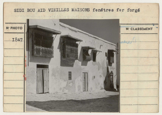 "Sidi Bou Aïd : vieilles maisons aux fenêtres en fer forgé". Cliché n°1847