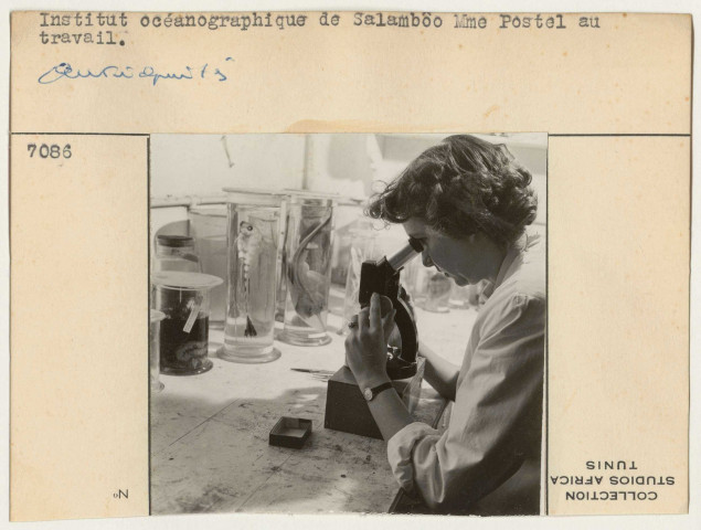 "Institut océanographique de Salambo : Mme Postel au travail". Cliché n°7086