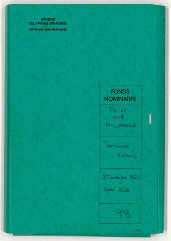 Les documents conservés au ministère des Affaires étrangères concernent presqu'exclusivement la politique étrangère de l'époque où Millerand était président de la République, de 1920 à Juin 1924 ; quelques dossiers sont plus anciens : ainsi ceux des questions coloniales (1894-1921) et de la Suisse (1912-1924).
