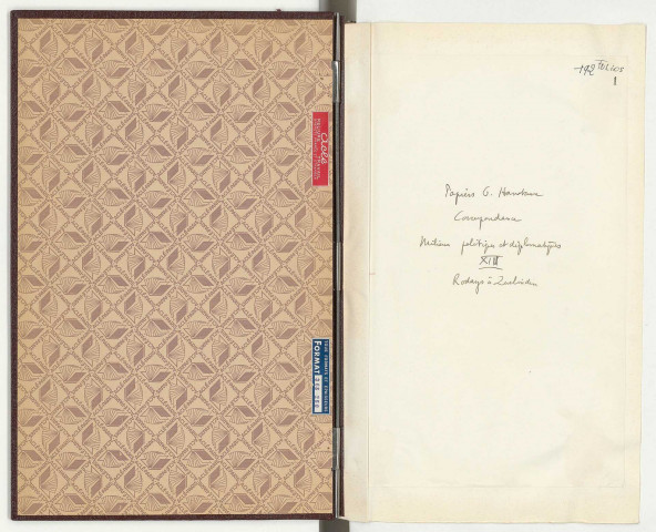 Un premier tri permit de rendre en juin 1956, 18 cartons à M. Gabriel Hanotaux fils. Il en restait 23, lorsqu'à la séance des archives diplomatiques du 7 juillet 1959 fut présenté le classement dû à M. de Pins (procès-verbaux des séances, t. VIII, p. 179).