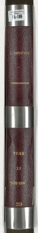 C'est ce classement qui a été repris par M. Dethan lorsqu'il a été question, à la suite de l'arrêté du 5 août 1965, de livrer au public les papiers d'agents antérieurs à 1914 et de les préparer pour la reliure. La refonte du classement a porté surtout sur la partie intitulée "mémoires et documents" par M. de Pins et qui remplissait les 13 premiers cartons. De ces diverses pièces diplomatiques rassemblées par Gabriel Hanotaux un choix a été fait, les copies ou doubles de la correspondance officielle étant rassemblés, dans un ordre chronologique, à la fin de cet inventaire.