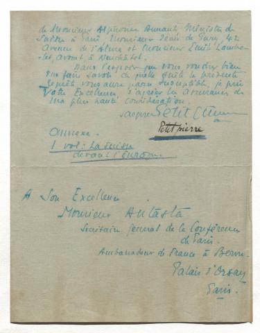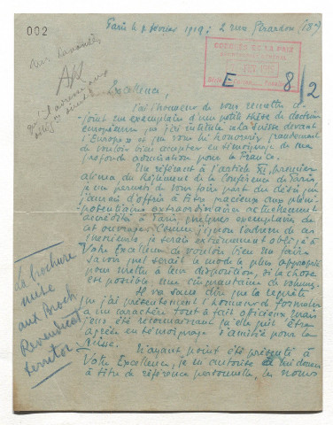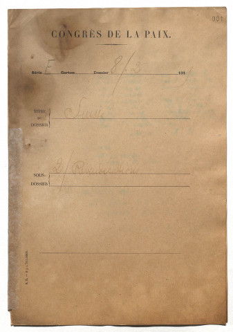 Défense de la neutralité suisse et d'une libre navigation sur le Rhin, demande de participation de la Suisse à la réflexion sur la constitution de la Société des nations : brochures dont Bulletin officiel de la Conférence internationale ouvrière et socialiste, correspondance avec le secrétariat général de la Conférence de la paix (février-avril 1919).