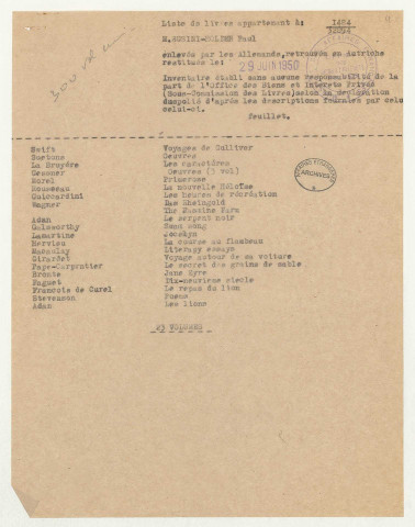 Cette sous-série contient des dossiers nominatifs de réclamations adressés par les victimes (institutions ou particuliers) à la sous-commission des livres de la Commission de récupération artistique.