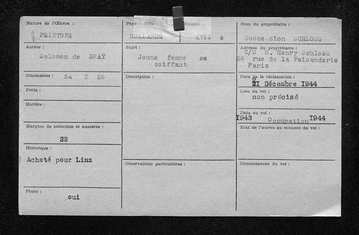 Les fichiers d'œuvres spoliées (série « Fichiers », cotée 209SUP/738-887) ont été établis d'après les déclarations de victimes ou d'après la listes des biens retrouvés en Allemagne et en Autriche.