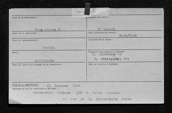 Pour les fiches peintures et dessins (cartons 738 à 760 et 805bis à 809), voir la liste Excel. Les informations relatives aux restitutions ou aux non restitutions doivent pêtre prises avec précaution et confirmées par les décharges de restitutions (série CRA ou série 13BIP).