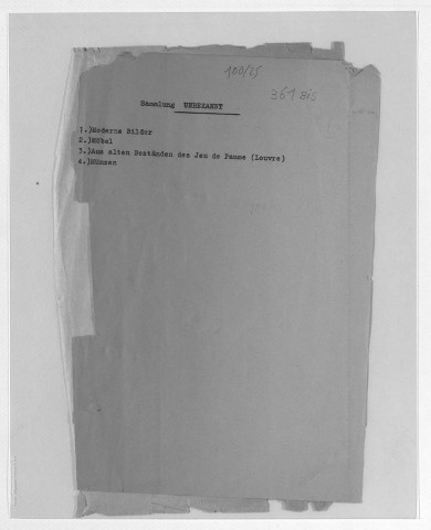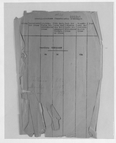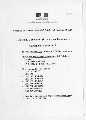 Copies des listes d'œuvres dressées par le service allemand ERR au moment des spoliations. S'y ajoutent des archives retrouvées par les Alliés documentant l'activité de l'ERR.