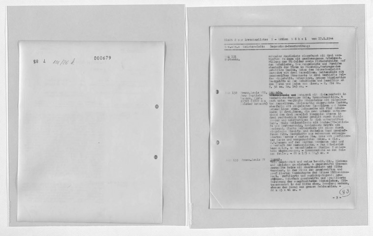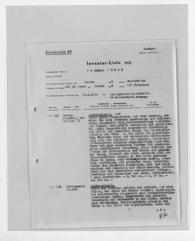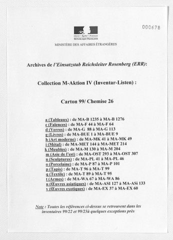 Copies des listes d'œuvres dressées par le service allemand ERR au moment des spoliations. S'y ajoutent des archives retrouvées par les Alliés documentant l'activité de l'ERR.