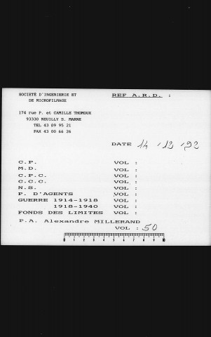 Le reste des papiers laissés par Millerand a été remis à la Bibliothèque Nationale qui les a ensuite cédés aux Archives nationales où ils sont conservés sous la cote 470 AP, voir fiche descriptive du fonds, pp. 725-727.