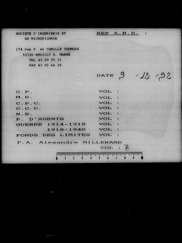 Le fond Millerand comprenait au départ 41 cartons; le travail de classement a surtout consisté en l'articulation des différentes séries qui ont été divisées en 101 volumes : les plus intéressants ont été reliés. Un inventaire numérique du nouveau classement a été établi; pour faciliter les recherches, on a dressé une table de concordance de l'ancien et du nouveau classement.