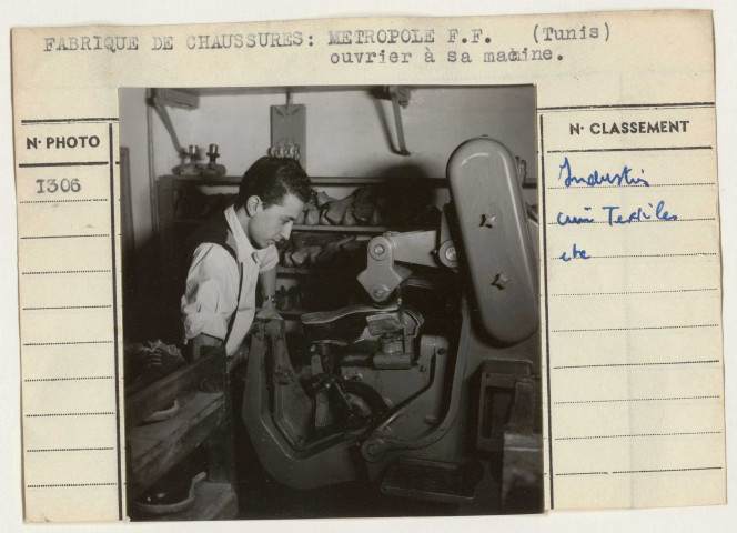 "Fabrique de chaussures, métropoke F.F. (Tunis) : ouvrier à sa machine".Cliché n°1306