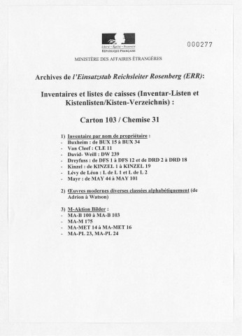 Copies des listes d'œuvres dressées par le service allemand ERR au moment des spoliations. S'y ajoutent des archives retrouvées par les Alliés documentant l'activité de l'ERR.
