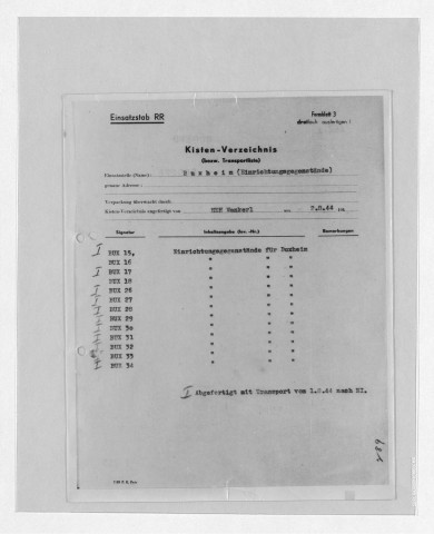Convois pour Nikolsburg les 16 juin et 1er août 1944 (liste des caisses et inventaire)