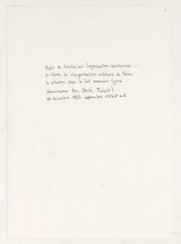 Après avoir suivi les cours du centre des Hautes études militaires (399 PAAP/49), le colonel Gouraud part en 1911 au Maroc. Il est alors chargé du commandement de la région de Fès. Il mène des combats victorieux qui lui valent d'être promu général de brigade (399 PAAP 50-54, où sont consignés tous les détails de la marche et de l'organisation de la colonne de renfort, placée sous son commandement). Les comptes rendus adressés au général Lyautey ainsi que les rapports de situation politique donnent une idée précise de l'organisation politique et militaire de la région de 1912 à 1914 (399 PAAP/55-59). Il est nommé en 1914 au commandement des troupes du Maroc occidental et la presse s'en fait abondamment l'écho (399 PAAP/60-61).