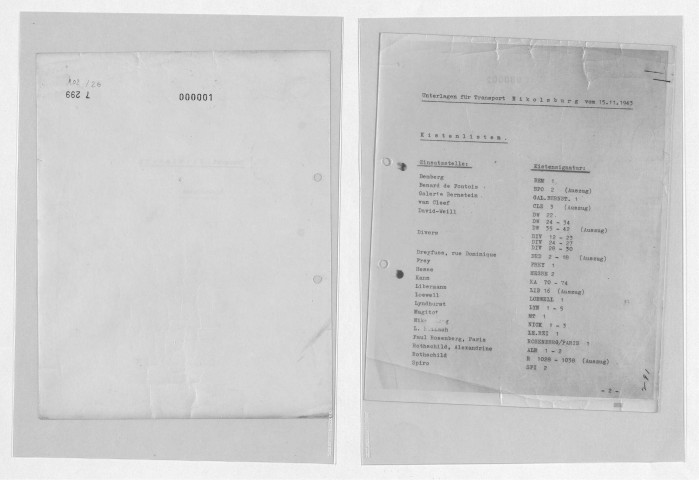 Convois pour Nikolsburg des 15 novembre 1943 et 21 décembre 1943, inventaire et liste des caisses par noms de propriétaire et par types d'objets :